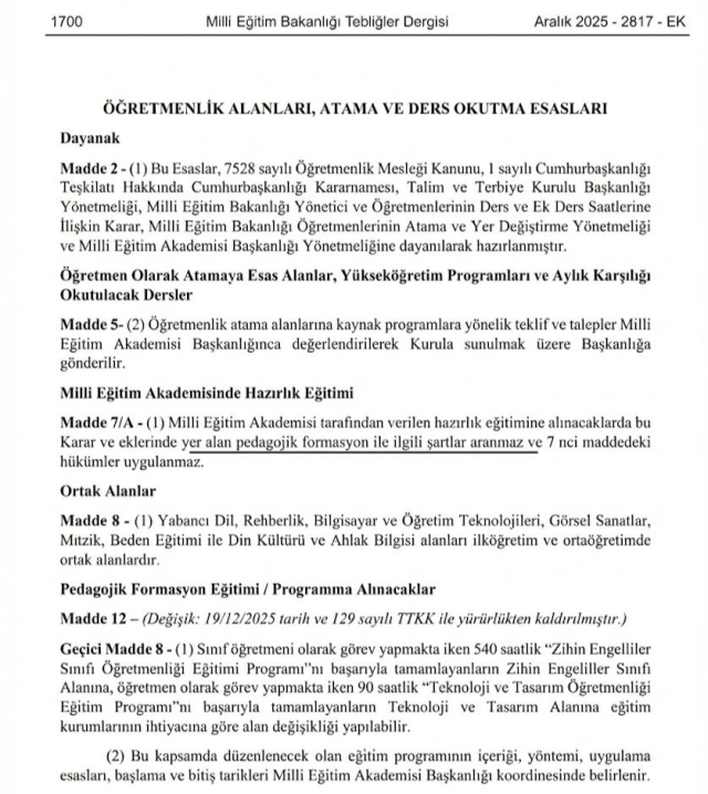 Milli Eğitim Bakanlığı (MEB), öğretmen atamaları ve mesleğe hazırlık süreçlerini doğrudan etkileyen kapsamlı bir düzenlemeyi yürürlüğe koydu. Aralık 2025 tarihli ve 2817 sayılı Tebliğler Dergisi’nde yayımlanan değişiklikle, öğretmenlik mesleğine girişte uygulanan temel şartlar yeniden belirlendi.